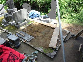 | 撤去が済んだ墓地 | 新しい墓地に据え付け中 | 据え付け完了 |