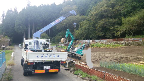 | 機材の搬入開始 | 小型のユンボとキャタピラの運搬車 |