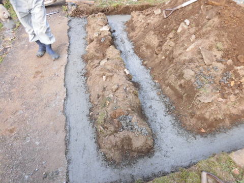| お墓の撤去完了 | 巻き石工事のために基礎モルタルを施工 | ||