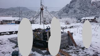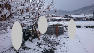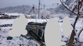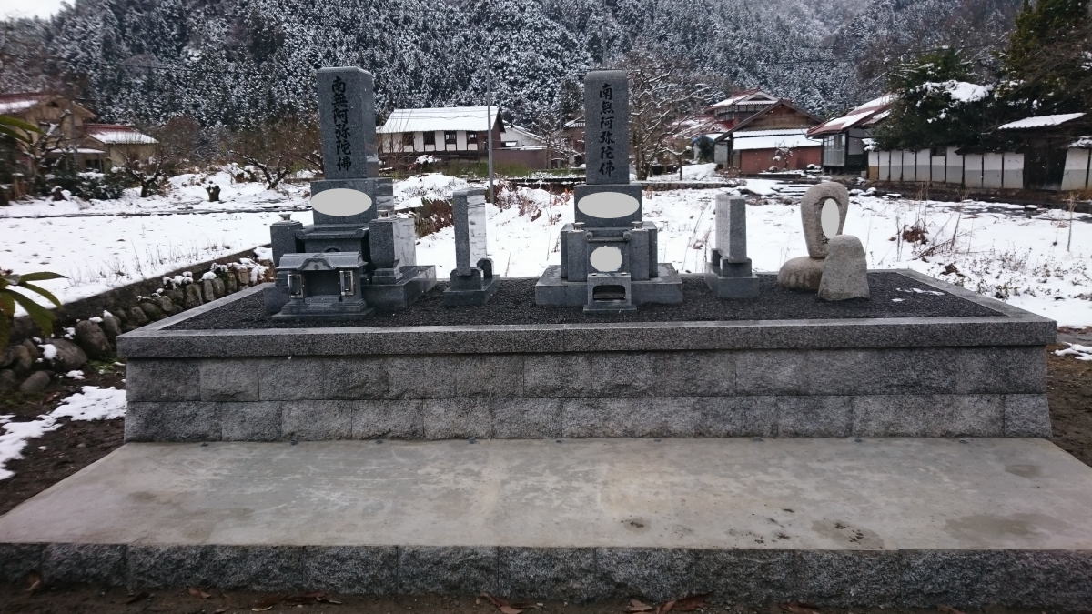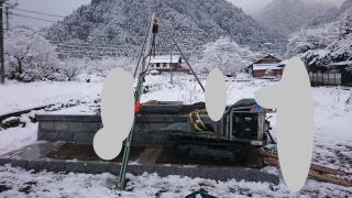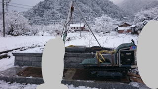 | 墓石の据え付け開始 古い墓石と 新たに9寸の墓石を新設します この日は雪 これからはここらでは雪の日が多くなり 法事の日程などもあって墓石の建立 |