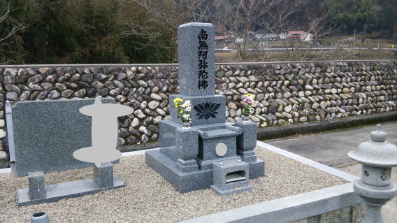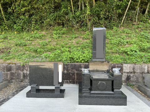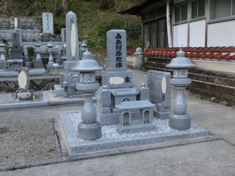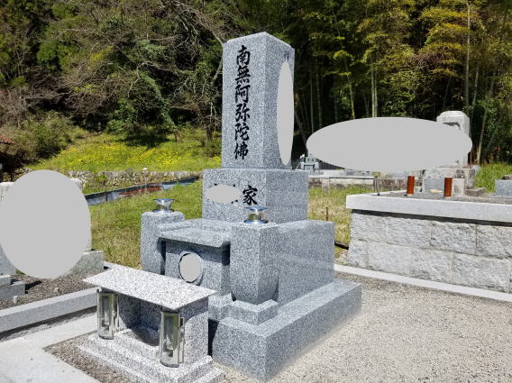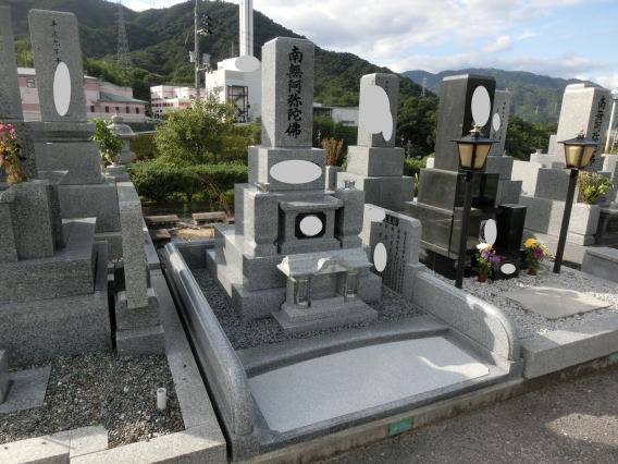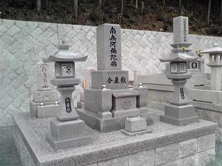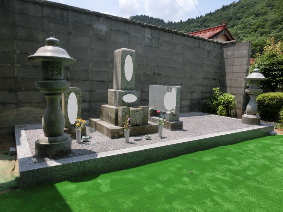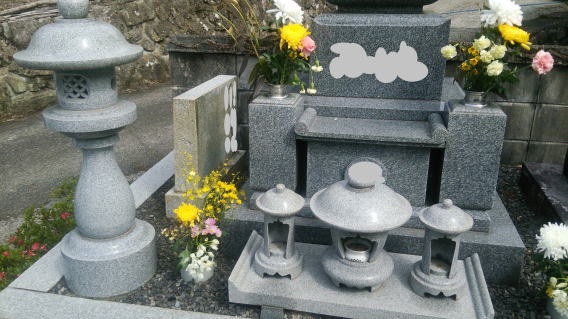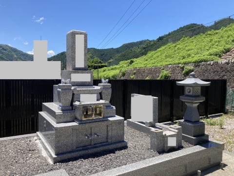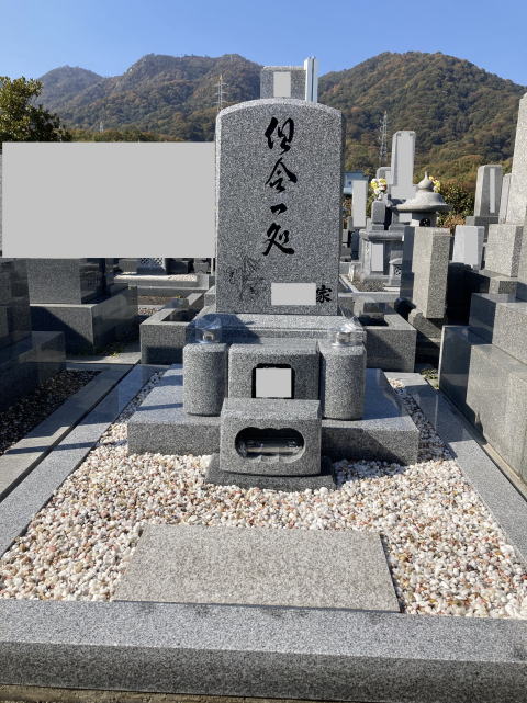 8寸大島石(伊予石)の墓石と墓誌 両側には 3尺5寸の角型墓前灯篭 お墓の前には 笠付の香炉ローソク立て |