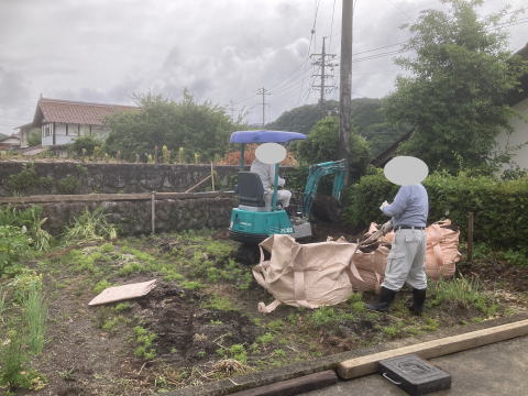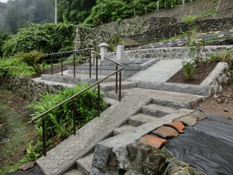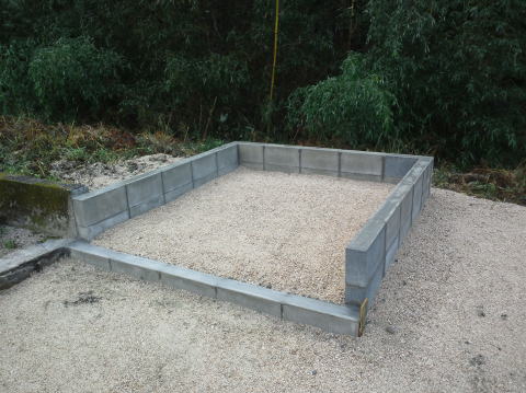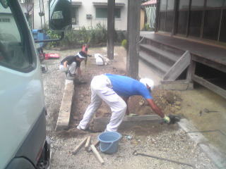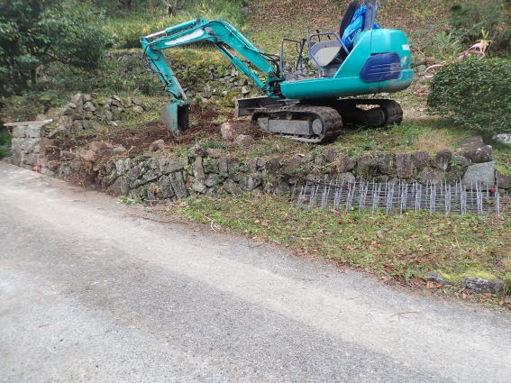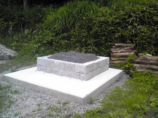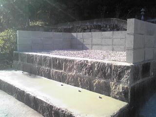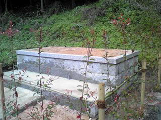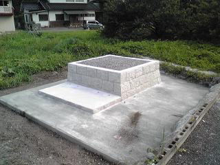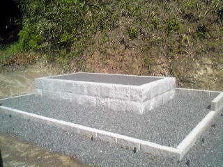 新墓地の造成工事です。 元は畑ということで肥土を取り除き、地盤の改良からです。その後、基礎の生コンをうち、割石と呼ばれる石を築いていきます。 手前の1段のところは「参り所」といって、ここへ立ってお参りをします。 最後にコンクリートで仕上げます。 |