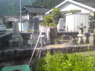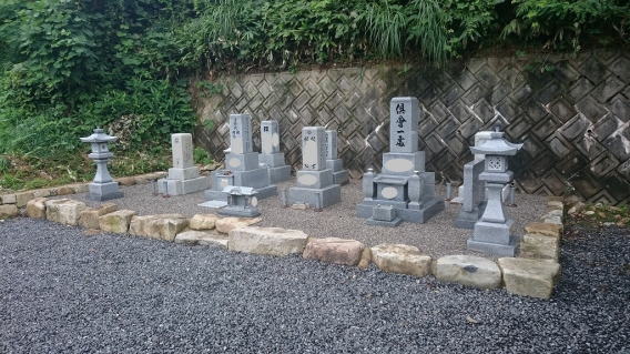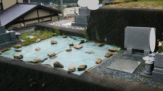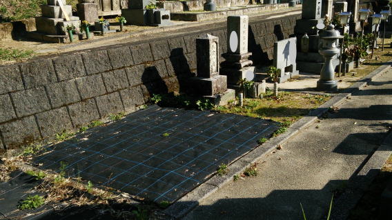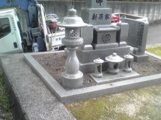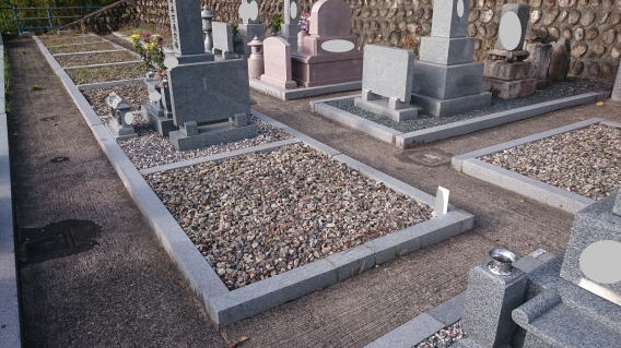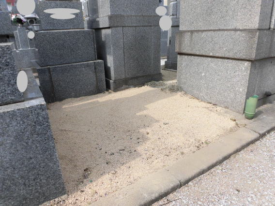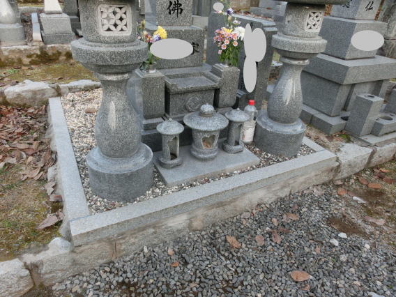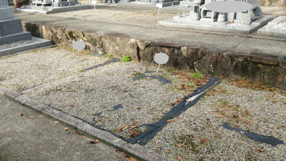 墓地に巻き石(長石)を巻きました 墓石の清掃 墨入れ 花立ての穴あけ(ステンレスパイプ)後には 法名石の新設 墓地の両側に 丸型の墓前灯篭 そして 墓地全体に 防草マサ(雑草が生えないと言われている)を敷き詰めました |
