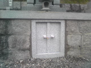 洋型墓石の新設です。 地上納骨型の墓石です。骨壺も9~12くらい収められます。 入口には南京錠などの鍵もつけられますので安心です。 また、このたびは墓誌はありませんが、法名・戒名等は裏側へ彫ります。 ちなみに今回はカニクレーンを使用して据え付けをしました。 |