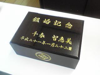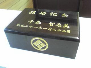 銀婚記念の リン棒(仏壇のお参りするときにたたく鈴のたたき棒)の台石です 黒御影石に銀婚記念の文字と 側面には家紋を彫りこみました 大きさは 280×180×105(ミリ) |