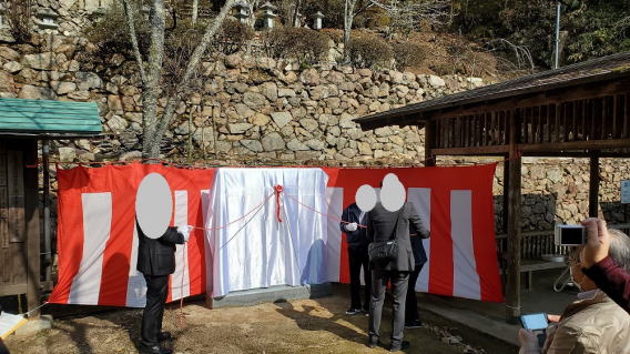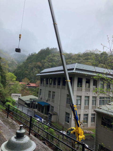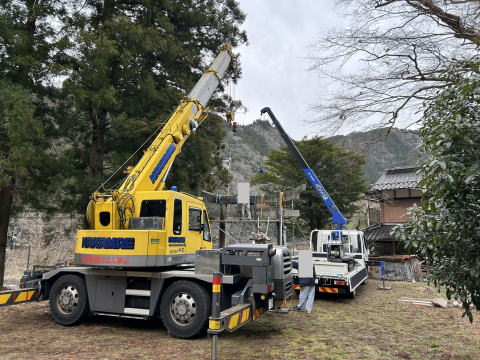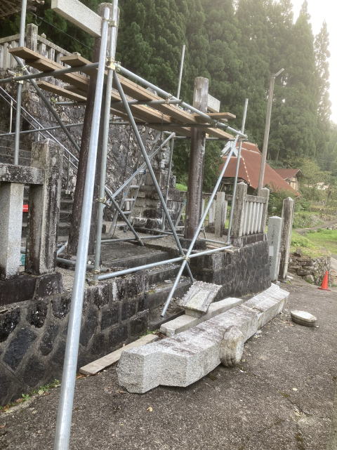 続きです! なんとか木を処理して足場をくみました。前にも鳥居の修復で足場を組んだことがあるのでスムーズにできました。ここからです。 大型のクレーンを依頼したのですが、何をするにも緊張しました。今にも倒れそうというのと、額束という石にひびが入っていることが分かっていたので、想定できる準備はして臨みましたが、とにかく緊張しました。 作業は無事完了!本当に安堵しました。 不思議なことがひとつ。 額束を工場へ持ち帰りクレーンで吊って下へ下した途端、その額束はお役目を終えたかのように静かに割れました。 作業途中に割れていたらと思うと怖くもあり、また不思議な力で守られていたようでもあり、よい経験をさせていただきました。 さてここからは額束を新らしくして組みなおします。 |