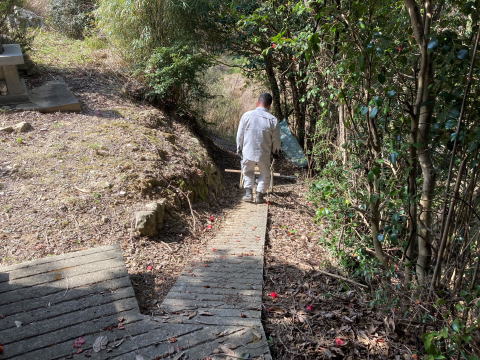 近年依頼が多くなってきている お墓じまいです。今回は小型の運搬車も入らず、人力のみでした。階段からお墓までは道幅50cmくらいしかなく石を縦にしたり横にしたり大変でした。階段も長く久々にバテました。 |