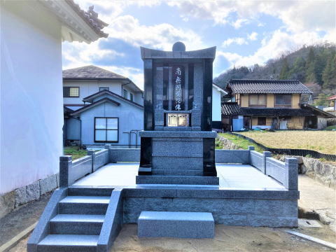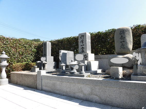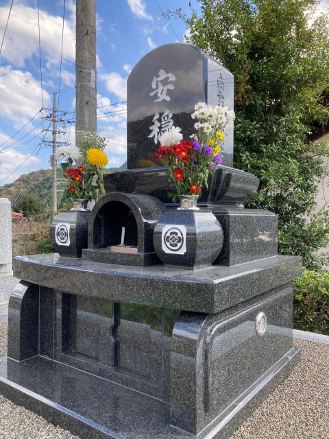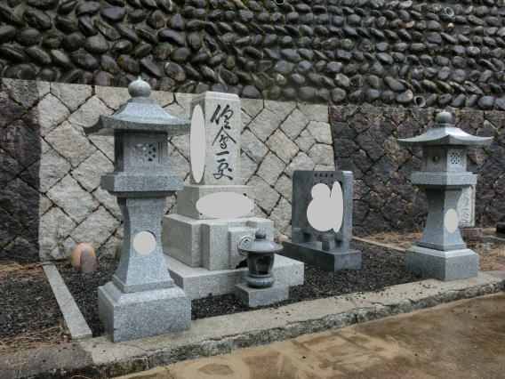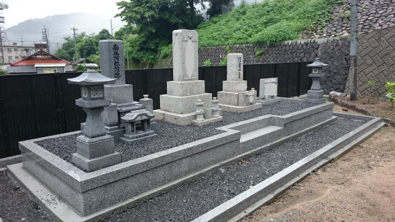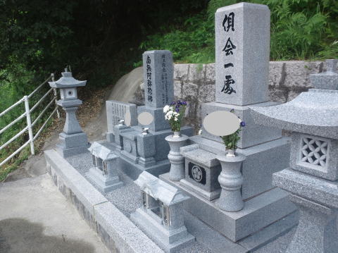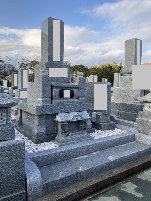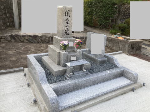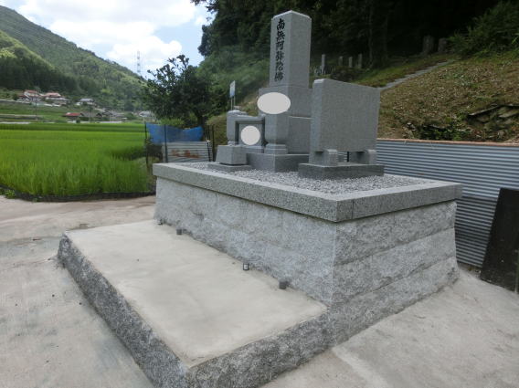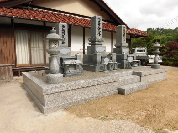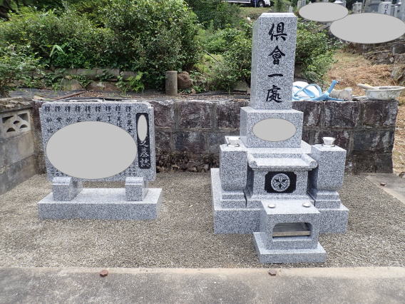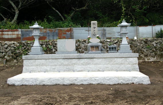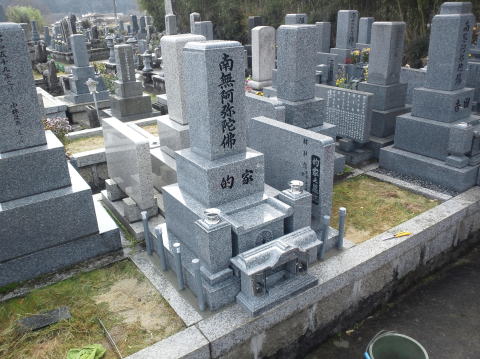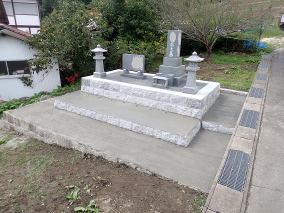 8寸 (大島石 伊予石)4段の新設 一番下の台石は4ツ組台です お墓の右側に墓誌の新設 お墓の前には 丸型の笠付き香炉3点セット |