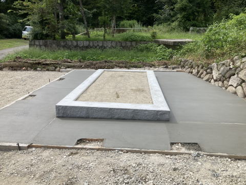 墓地新設及び駐車場 墓地の新設には許可申請からお手伝いさせていただきます。役所や農業委員会への申請が必要です。細かい図面なども必要ですし場合によっては司法書士、土地家屋調査士などとの連携も必要になってきます。何でもご相談くださいね。 今回は駐車スペースもほしいとのことでかなり広い範囲の土間打ち(コンクリート打設)でした。穴を開けているのは最後にフェンスをするための準備です。墓石設置後無事完了しました。 |