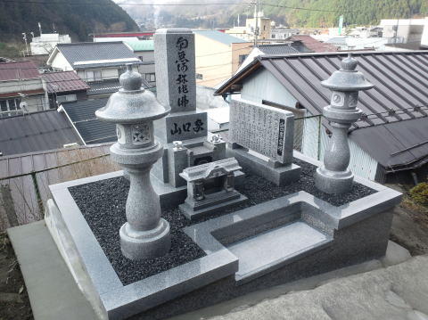 お墓の後ろに墓誌(法名石)の増設 両側には 墓前灯篭(丸型)の増設 |