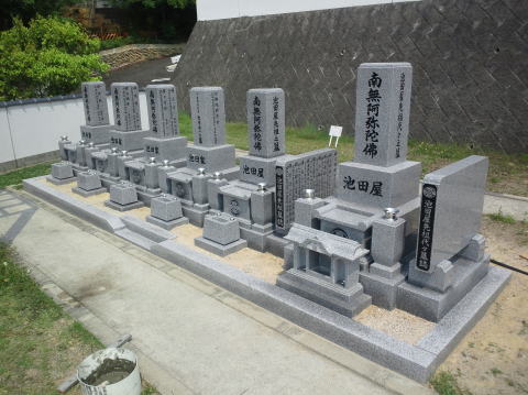広島市内でのお墓の新設 大きな霊園での施工です。 たまたま知り合いの石屋さんに2人も会ったりといいスタートでした。今回は舞台付(地上納骨型)のお墓です。納骨スペースも広く、全体の背丈も高くなるため豪華です。 |