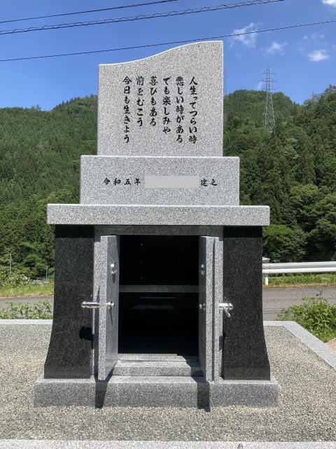 移設したお墓と、新設の納骨堂型のお墓 個人のお墓で納骨堂型というのは私も初めての経験でした。デザインの完成まで何度もご夫婦で当店に足を運んでくださりました。特に奥様がしっかりとこだわって頂き、表文字とリンゴは奥様の揮毫です。裏の詩も奥様が考えられたもので、お子様やお孫様、その先の子孫への想いや気持ちがすごく伝わってくるいいお墓だと思います。 想いを形にしていくのが我々の仕事だと思っておりますが、お客様にも大満足と言っていただいたので本当に嬉しかったです。時間はかかりましたが良いお墓ができたと自負しております。 ありがとうございました。 |